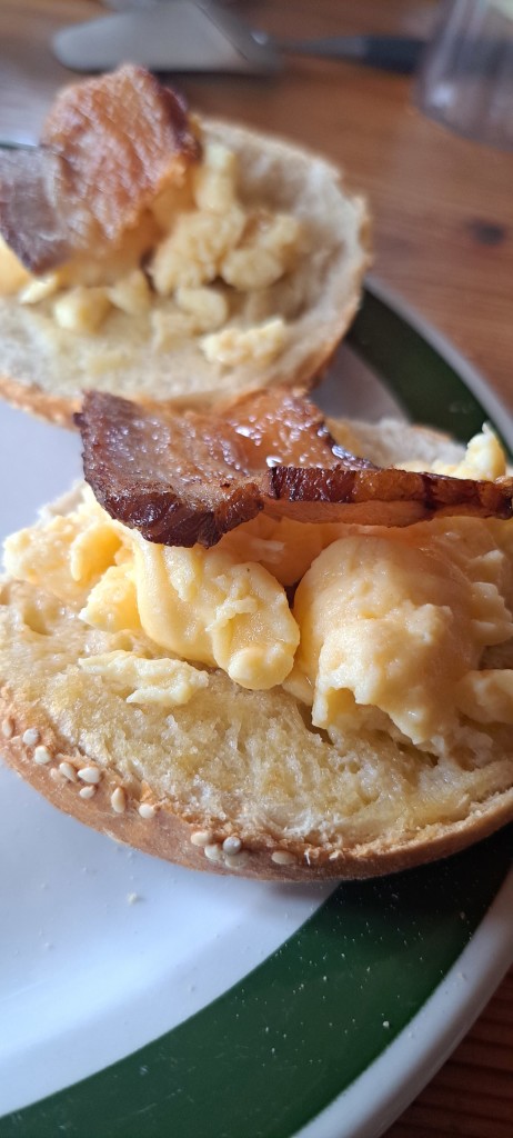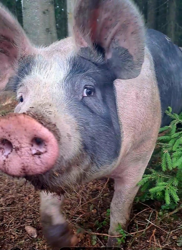 Grisen på gården er av rasen Hampshire som er en rase med mye intramuskulært fett, noe som gir et saftig og smakfullt kjøtt.