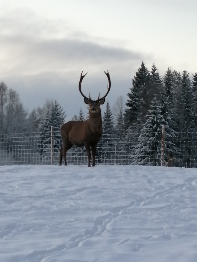 Gjennom de fire årstider har den tilgang på grovfor i form av grønne beiter eller eget produsert høy. I tillegg kjøres det inn bjørk og grankvister for ekstra kos. Vi har over 30 dyr som er grunnstammen og øker hvert år med antall hjort.