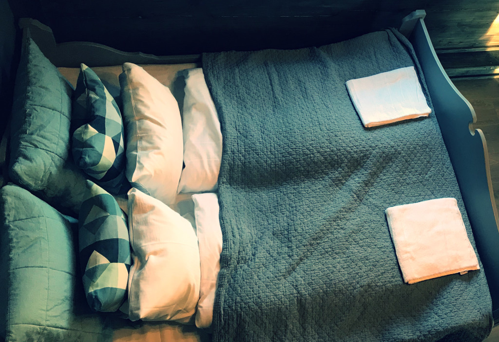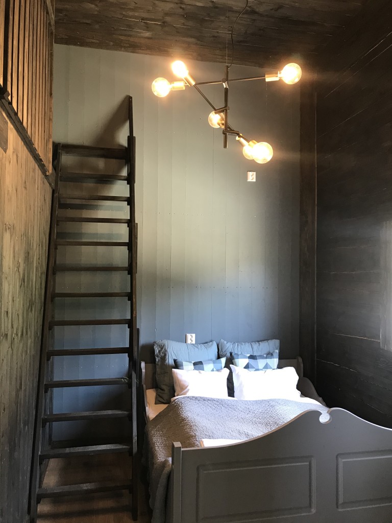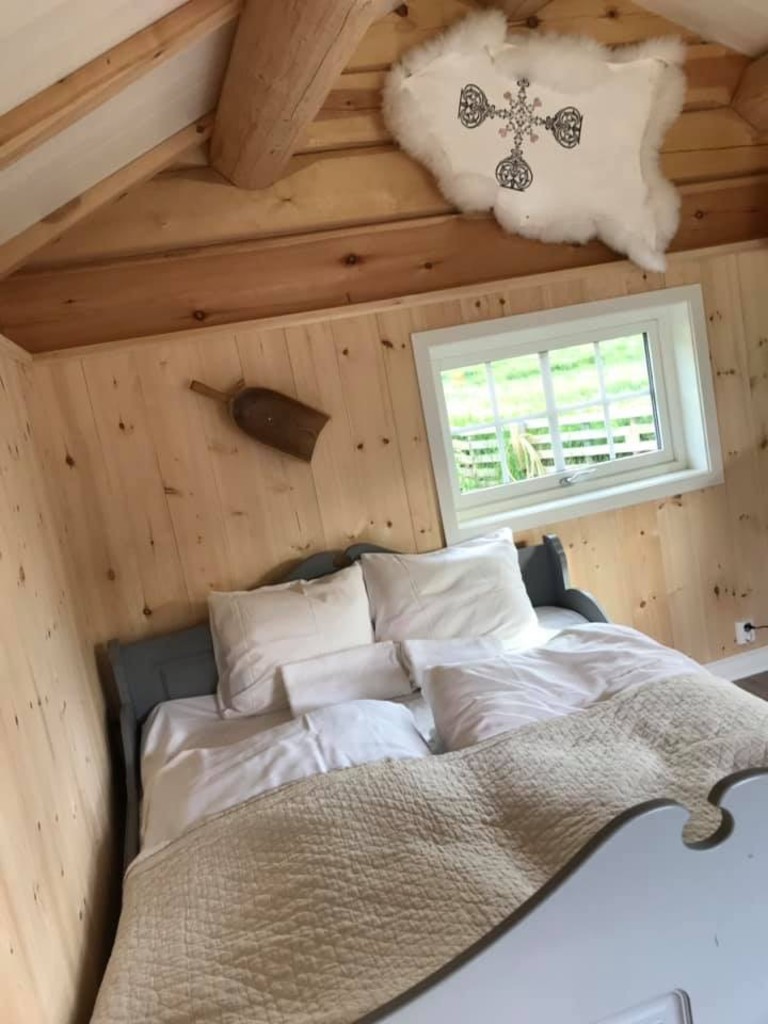 - I låven har vi et ‘de luxe’ rom til 5 personer. Dobbeltseng og 3 sengr på hems. Eget bad. Kjøkken og stue med peisi tilknytning til dette rommet.
