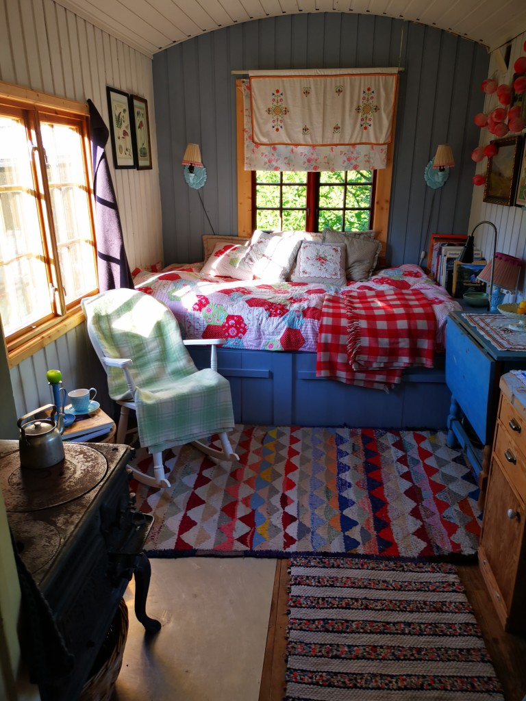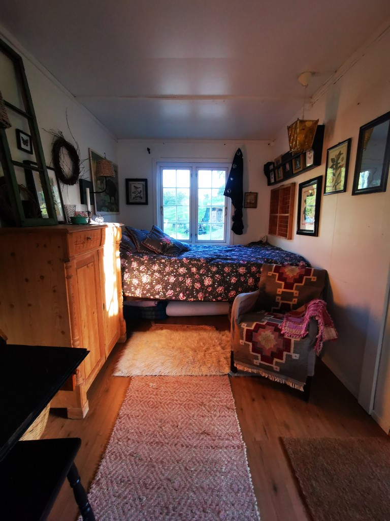 Systova/Crafters nest. Superkoseleg lite hus, ala cheperds hut, med lita dobbelseng (120×200) og vedkomfyr. Her kan de lage mat på vedfyrt omn. Det er eit gasbluss i tillegg, og høve til å låne kokeplater. Dette fiksar me etter korleis de vil ha det, når de kjem. Det er eit lite komposttoalett i hytta. Ekstra ved kan hentast på garden.