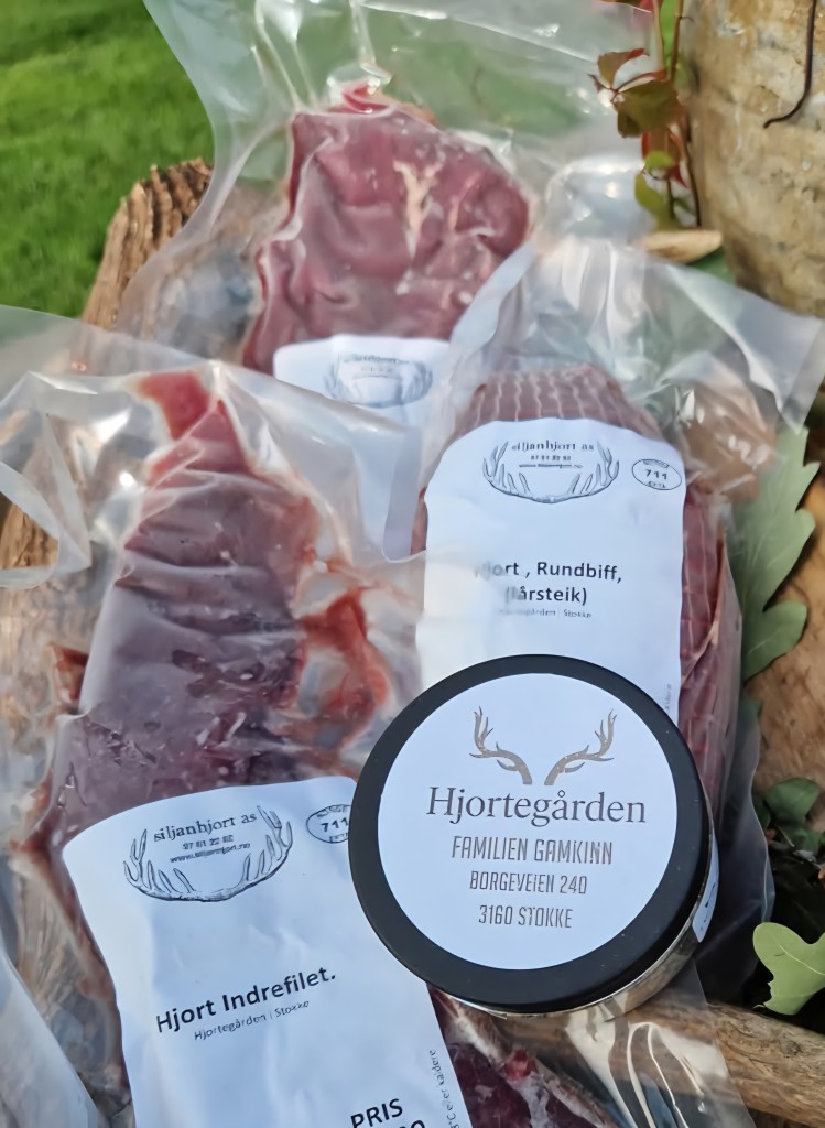 Hjortegården i Stokke ligger sentralt plassert mellom Sandefjord og Tønsberg, Vi tilbyr salg av hjortekjøtt, spesialprodusert hjort-spekepølse fra egne dyr samt livdyrproduksjon i tillegg. Gården har vært i familiens eie siden 1700-tallet. Siden overtakelsen 2011 har vi opplevd økende interesse både for dyra, driften, gården og kjøttet. Både barnefamilier og voksne vil ha glede av å se foring av dyra og hygge seg i hagen på forhåndsannonserte dager.