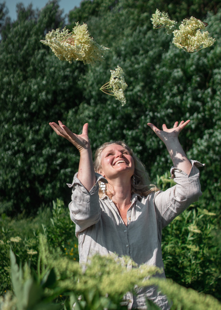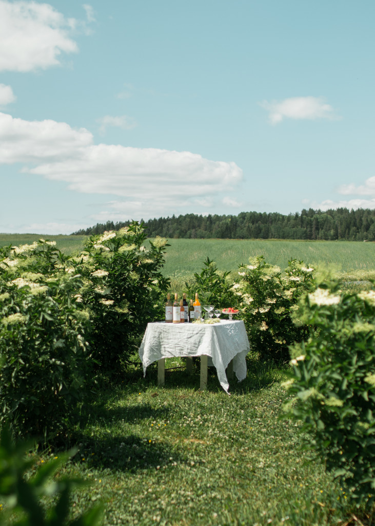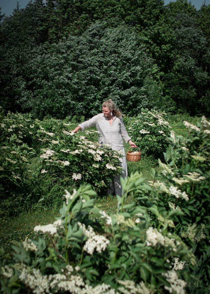 Rundt Sankt Hans innhøster vi blomster på tidlige morgenstunder for å få blomsten med høyest innhold av aroma. Innhøstning av blomster gjør vi på Hørte og på Rinde Gård på Akkerhaugen, og på gårder i Sauherad, Telemark. Produksjonen foregår på det lokale eplepresseriet Epleblomsten, hvor vi lar aromaen fra blomsten trekke ut i sukker/sitron-lake før det filtreres og tappes. Vi behandler den skånsomt så aromaen bevares på best mulig måte.
