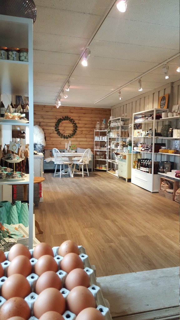 I butikken finner du et utvalg av delikatesser som kjøtt, ost, honning, sjokolade, lokalprodusert øl, gaveartikler, interiør og mange produkter du ikke finner andre steder.