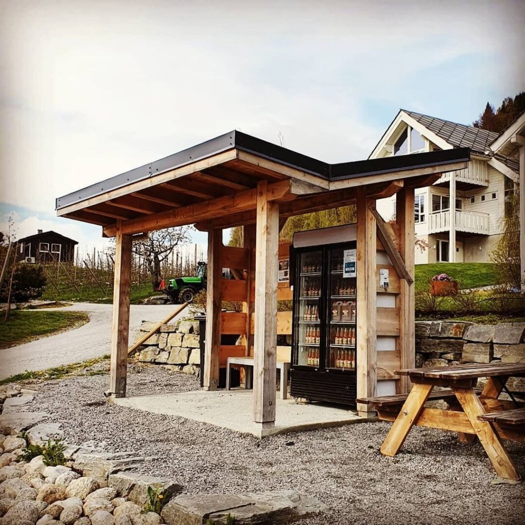 Utsalet vårt ligg mellom fruktre og gardstun i enden av Dronningstien og kan tilby iskald eplejuice som perfekt avslutning på turen. Gardsutsalet er i somarsesongen ope måndag til fredag 08.00 til 20.00 og laurdag 09.00 til 18.00. Utanom sesongen kan det vera lurt å ringe på førehand. Me tek imot grupper/ smakingar etter avtale.