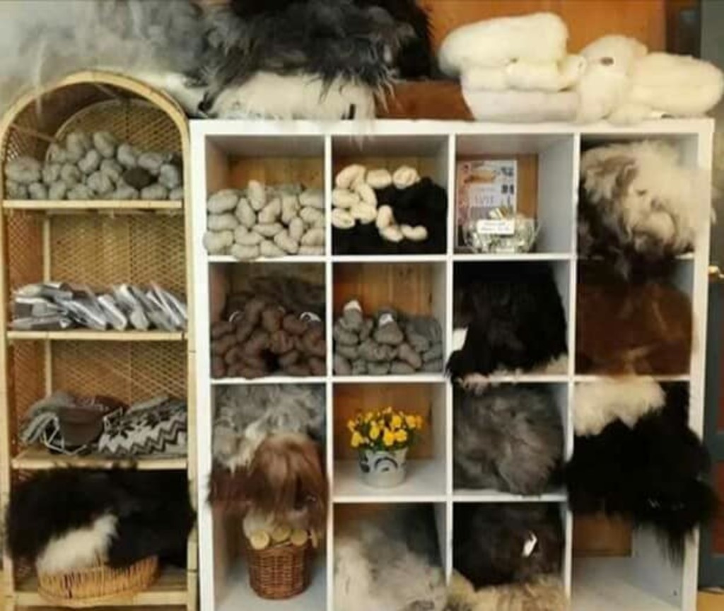 I den lille gardsbutikken/verkstedet i våningshuset har vi utsalg av nettopp strikkegarn, men også hele skinn og sitteunderlag med trykk, løpere til langbord av kuskinn mm, håndlagde såper, kjøtt av sau og lam (hele året) og fe (på bestilling høst). Vi har også tilgang til hjortekjøtt for bestilling.