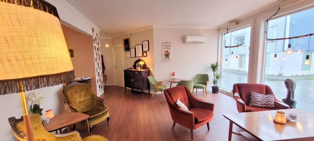 Koselig sitteplass der du kan nyte kaffe med Janet's famøse blåbærostekake Fotograf: Janet Roelofs