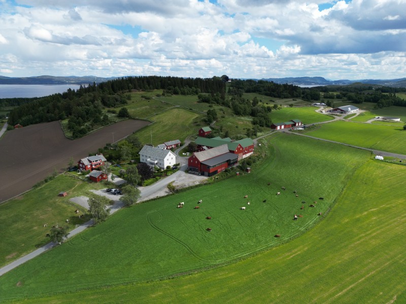Gården ligger vakkert til langs Den Gyldne Omvei i Inderøy kommune – et kjent reisemål for matelskere i Trøndelag.